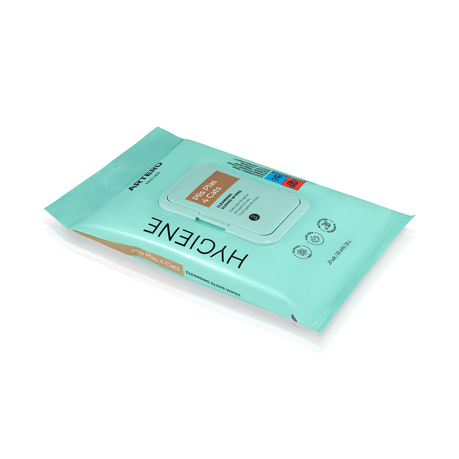 Nowoczesne jednorazowe rękawiczki pielęgnacyjne dla kotów od Artero z linii Plis Plas 4CATS, pokryte roztworem antybakteryjnym, który gwarantuje głębokie oczyszczenie sierści. Opakowanie zawiera 20 sztuk.