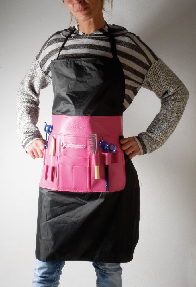 Fartuch posiada z przodu organizer na narzędzia takiej jak szczotki, nożyczki dzięki czemu wszystko mamy pod ręką.