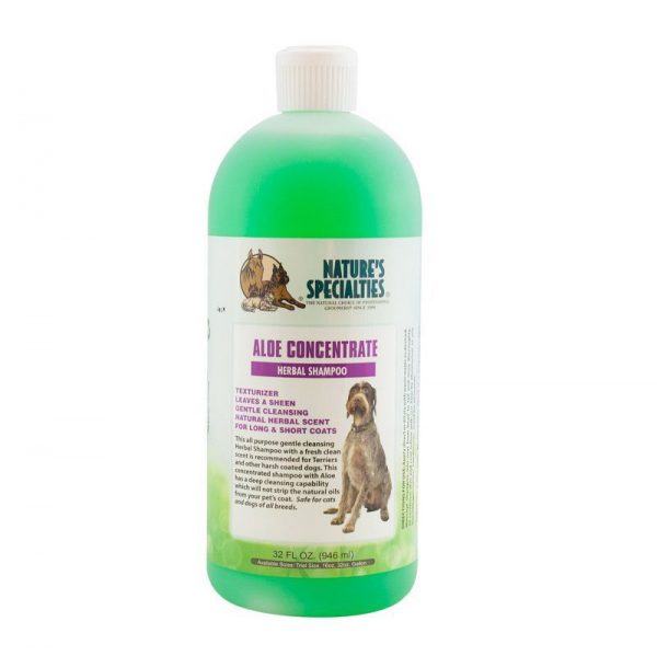 - Łagodny, ziołowy, głęboko oczyszczający szampon Aloe firmy Nature`s Specialties. Doskonale czyści głębokie partie sierści bez niszczenia naturalnej bariery oleistej włosa. Szampon zawiera aloes, olejki ziołowe, witaminy A,D i E, Pantenol, olejki eteryczne, które nadają sierści miękkości oraz pięknego połysku sierści psa, kota. Rozcieńczalność 1:16