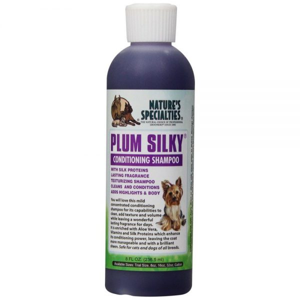 2. Łagodny szampon Plum Silky firmy Natures Specialties wysoko skoncentrowany, doskonale czyści, wygładza, utrzymuje odpowiednią teksturę sierści. Najlepiej znany ze swojego wspaniałego, długotrwałego zapachu. Koncentrat 1:24