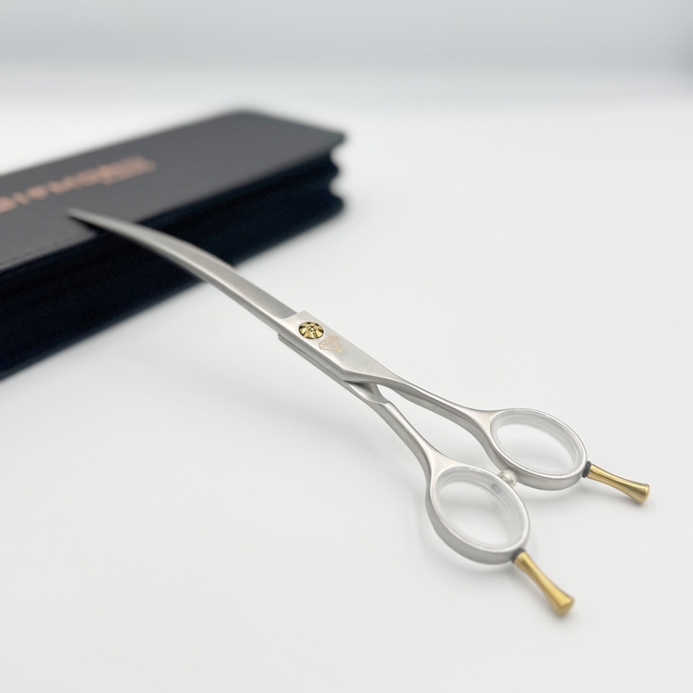 Wysokiej jakości nożyczki fryzjerskie z zakrzywionymi ostrzami. Japońska stal 440C. Nożyczki idealnie nadają się do tworzenia zaokrąglonych powierzchni przy łapkach, na głowie itp. Dzięki kątowi wygięcia nożyczek idealnie sprawdzają się do stylu asian oraz korean, gdzie tak pożądane są zaokrąglone precyzyjne cięcia.
