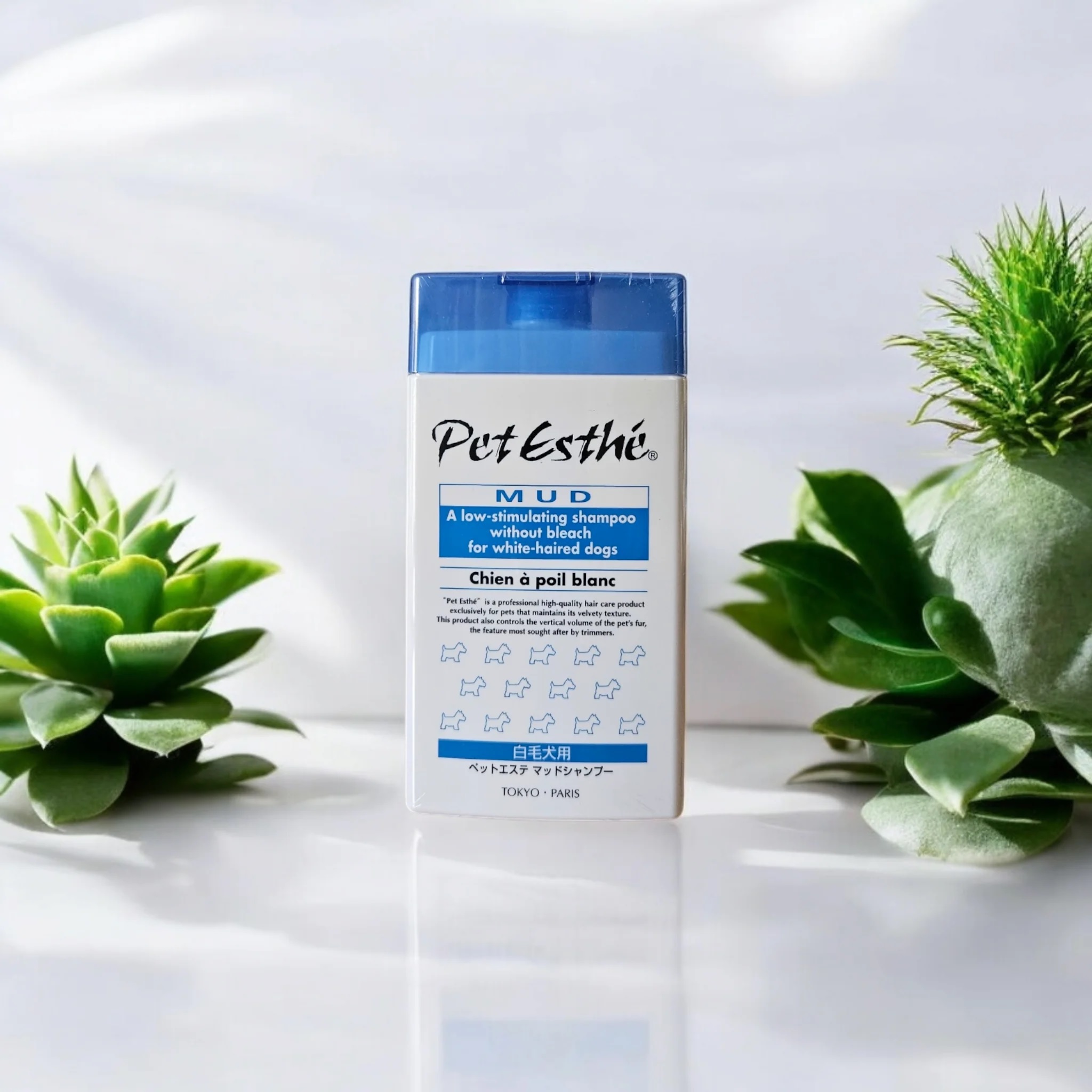 Pet Esthé Mud szampon dla psów o białej sierści.  Jest to ultra-hipoalergiczny szampon do sierści i skóry, który zawiera bazę roślinną z aminokwasów pochodzących z trzciny cukrowej i tapioki – roślin, które zapewniają najłagodniejsze składniki szamponu.