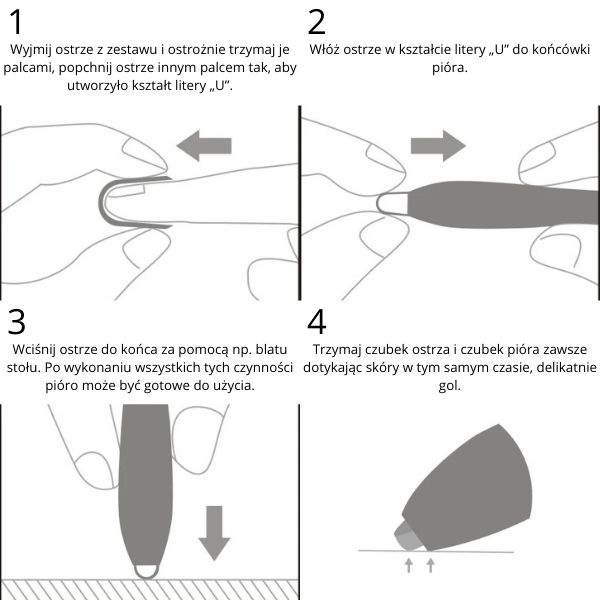 • DEMONTAŻ: Po zakończeniu używania, wepchnij szpilkę w wolne miejsce wewnątrz kształtu „U”, mocno przytrzymaj ostrze w kształcie „U” podczas wypychania ostrza za pomocą szpilki.