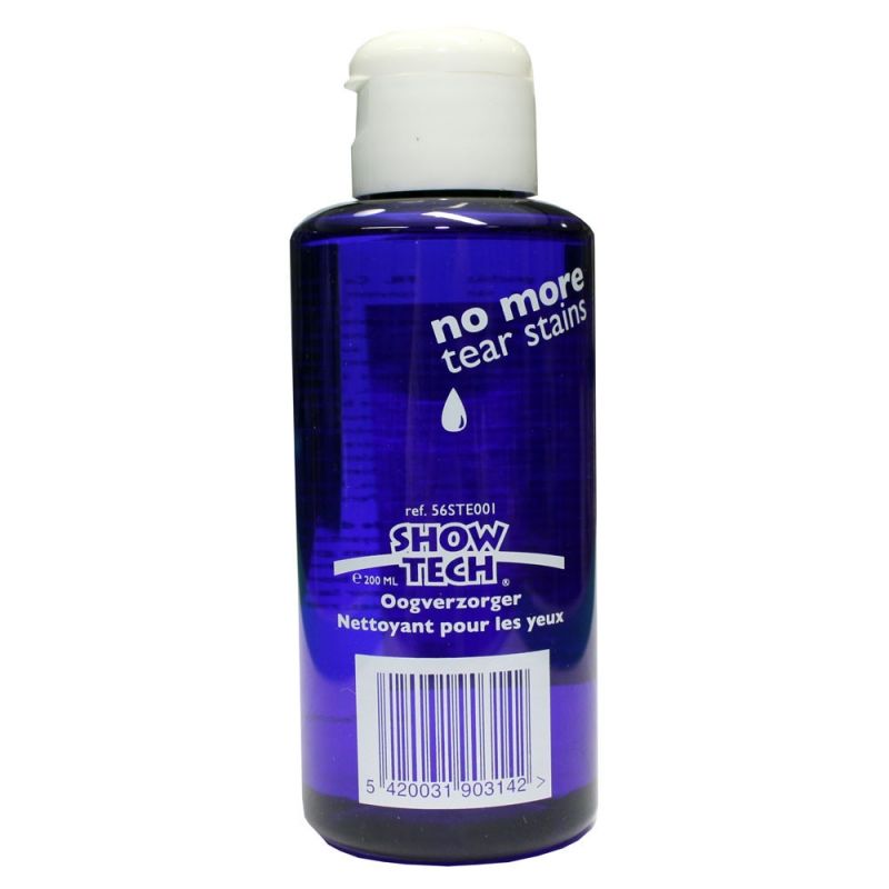 Płyn Show Tech No More Tears leczy i pomaga zapobiegać problemom związanym z nadaktywnością kanałów łzowych. Rasy z krótkimi nosami cierpią z powodu zablokowanych kanałów łzowych, które powodują, że łzy stają się brązowe i przebarwiają włos.