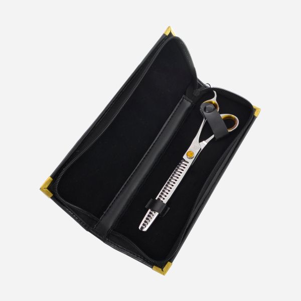 Nożyczki zapakowane w eleganckim, skóropodobnym futerale.