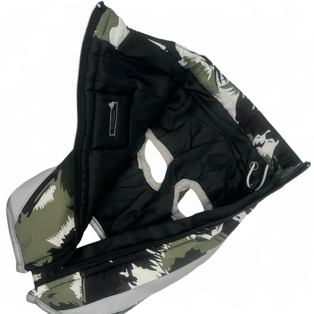 - Specjalny otwór na plecach umożliwiający wpięcie smyczy lub obroży bez zdejmowania kurtki