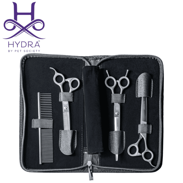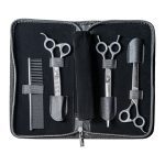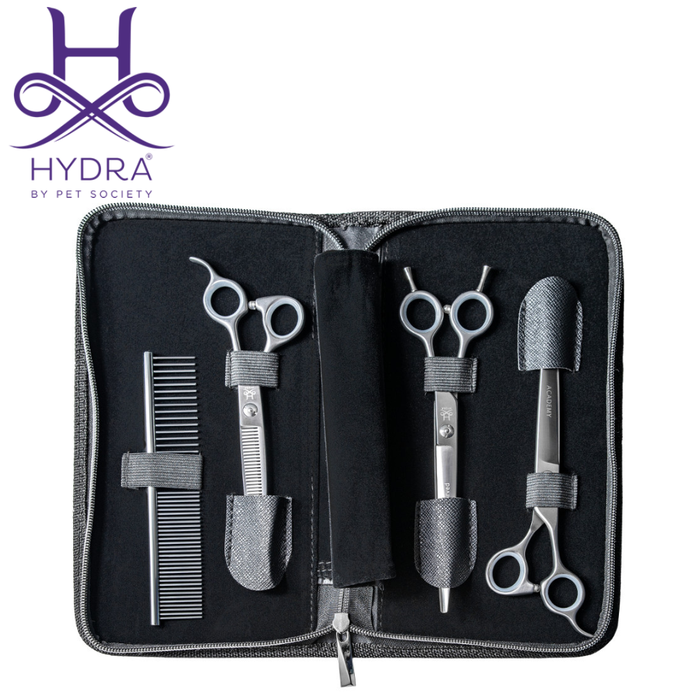ACADEMY SET to zestaw trzech nożyczek i grzebienia w przystępnej cenie, przeznaczony dla początkujących lub uczących się fryzjerów.